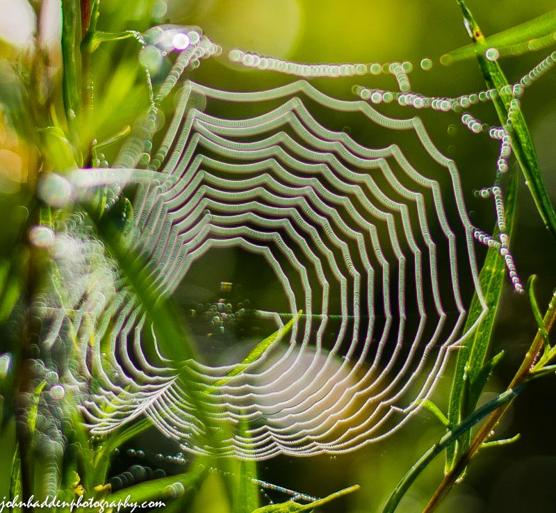 Off-focus and shallow depth of field create a nearly neon effect on this tiny spider’s web in our front field.