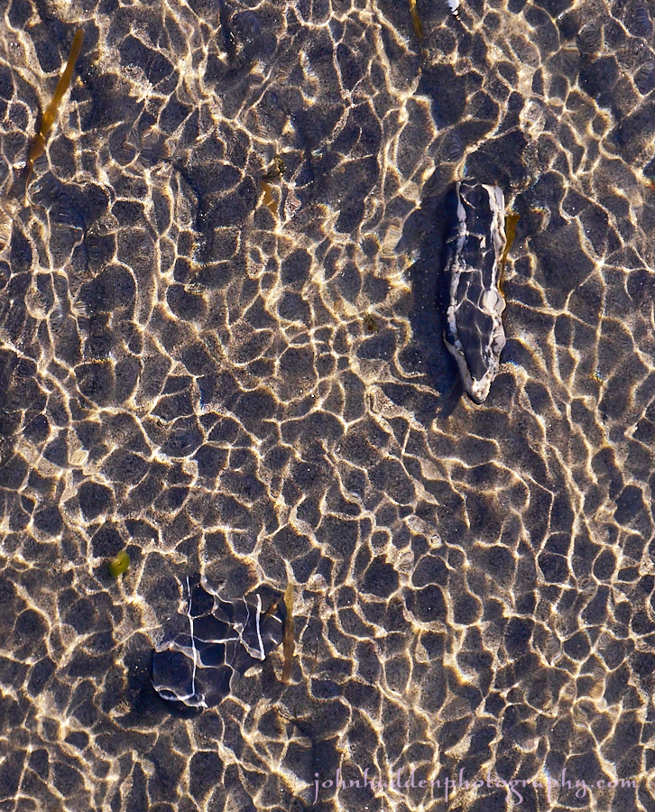 We made a brief stop at Shelburne Beach yesterday afternoon. The Lake Champlain water level is quite low right now (93.87′ feet—the record low was 92.61′ above mean sea level on December 4, 1908.) There were numerous sandbars exposed going out past the usual pebble and stone shoreline. The sunlight dappled nicely as small wavelets lapped across the sand. The stones in the shot are Iberville shale, a distinctive dark gray and white shale streaked with calcite.