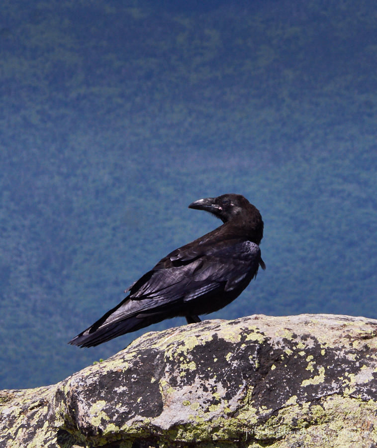 I hike the Franconia Ridge in the White Mountains the other day. Two ravens were mingling with the other hikers atop Little Haystack Mountain looking for dropped food or handouts—no doubt a pretty reliable source of food for the birds. Ravens are very intelligent birds (like all corvids including crows and jays). I got the impression that these two birds hung out on the summits a lot as they were quite used to people (not necessarily a good thing…) They let me get within about 3′ of them!