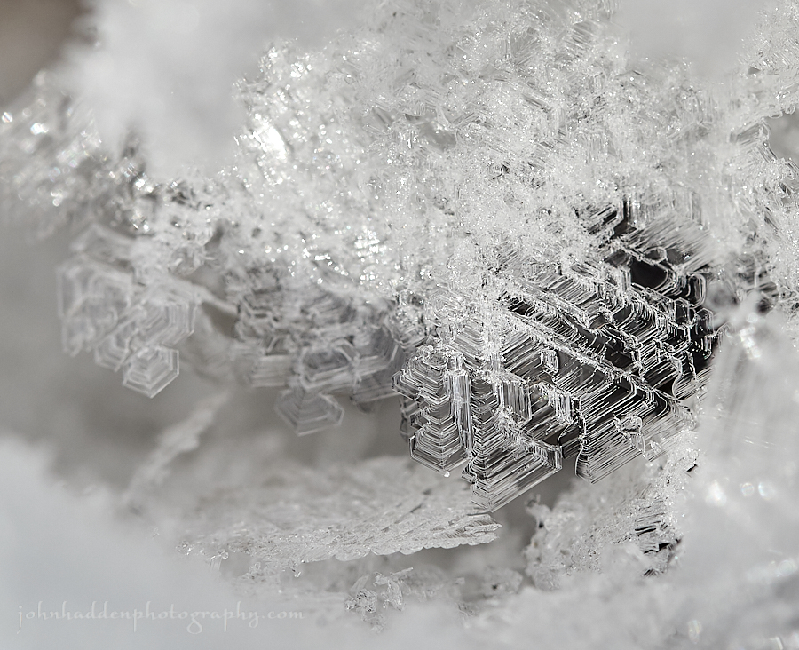 Bundling up and marching off into the snow when it’s below zero has its rewards. These tiny and delicate hexagonal plate ice crystals formed along the bank of Fargo Brook where stream undercutting has exposed bare soils to the frigid air. When damp warmth filtering out of the ground meets the air the crystals form. These crystals were only a few millimeters wide so getting in close with a macro lens was necessary.