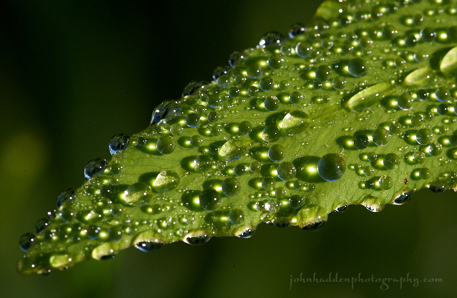 Tiny dew droplets sparkle in the morning sun in this very close look at a blade of grass. The “large” central drop is perhaps on millimeter in diameter.